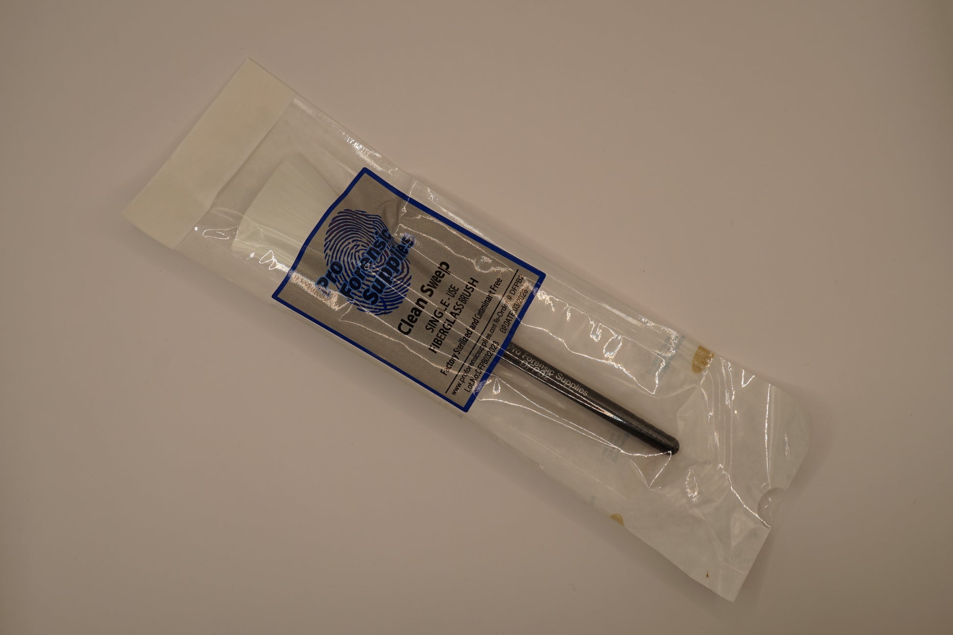 Individually packaged fiberglass fingerprint brush intended for single-scene use. The brush is chemically sterilized and packaged in a high-grade medical paper. The handle length is 4.5 cm.